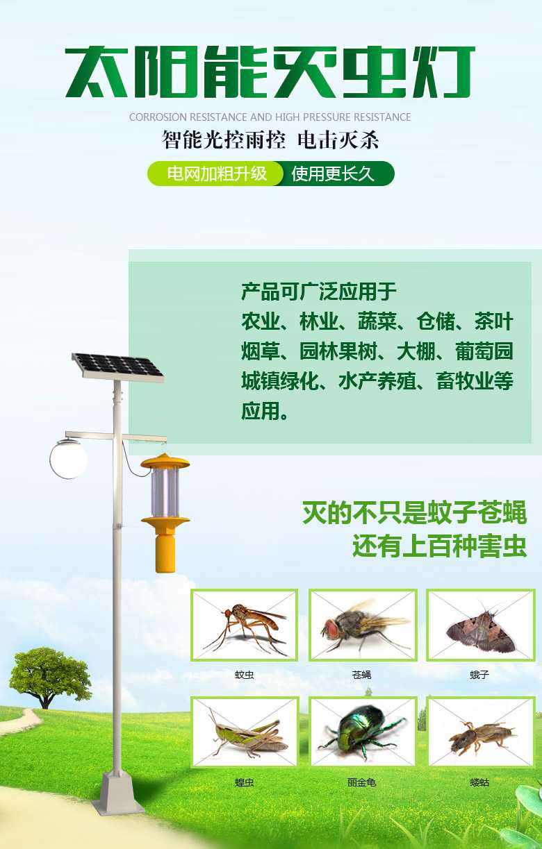 頻振式太陽能殺蟲照明一體燈具有光控、時控、雨控、過充、過放保護功能及微電腦自動保護系統(tǒng)。全天候,不怕水,耐高溫,防腐蝕,移動方便。園林公園,別墅群,庭院,藥材基地、蔬菜基地、茶園等場地使用。